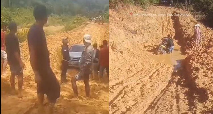 Viral jalan di Desa Bukit Bulan, Kecamatan Limun, Kabupaten Sarolangun, Jambi rusak parah bak sawah berlumpur.