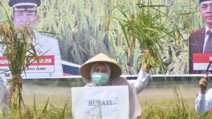Bupati Muaro Jambi Masnah Busro panen perdana padi varietas unggul Sailun Salimbai di Desa Pudak, Kabupaten Muaro Jambi.