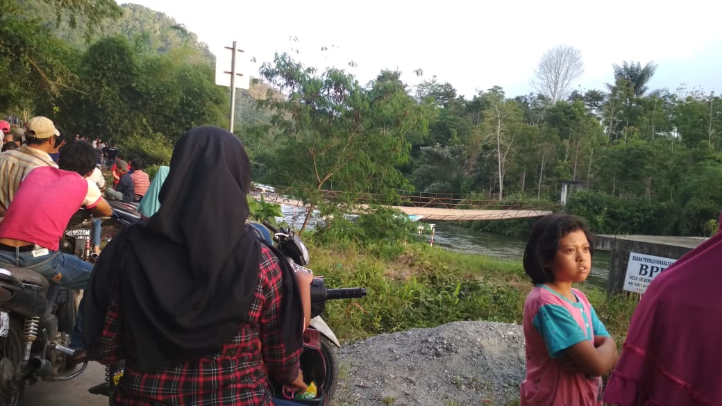 Tali sling jembatan gantung Palonk Malgan putus. Puluhan orang di atas jembatan gantung tersebut terjatuh ke sungai.